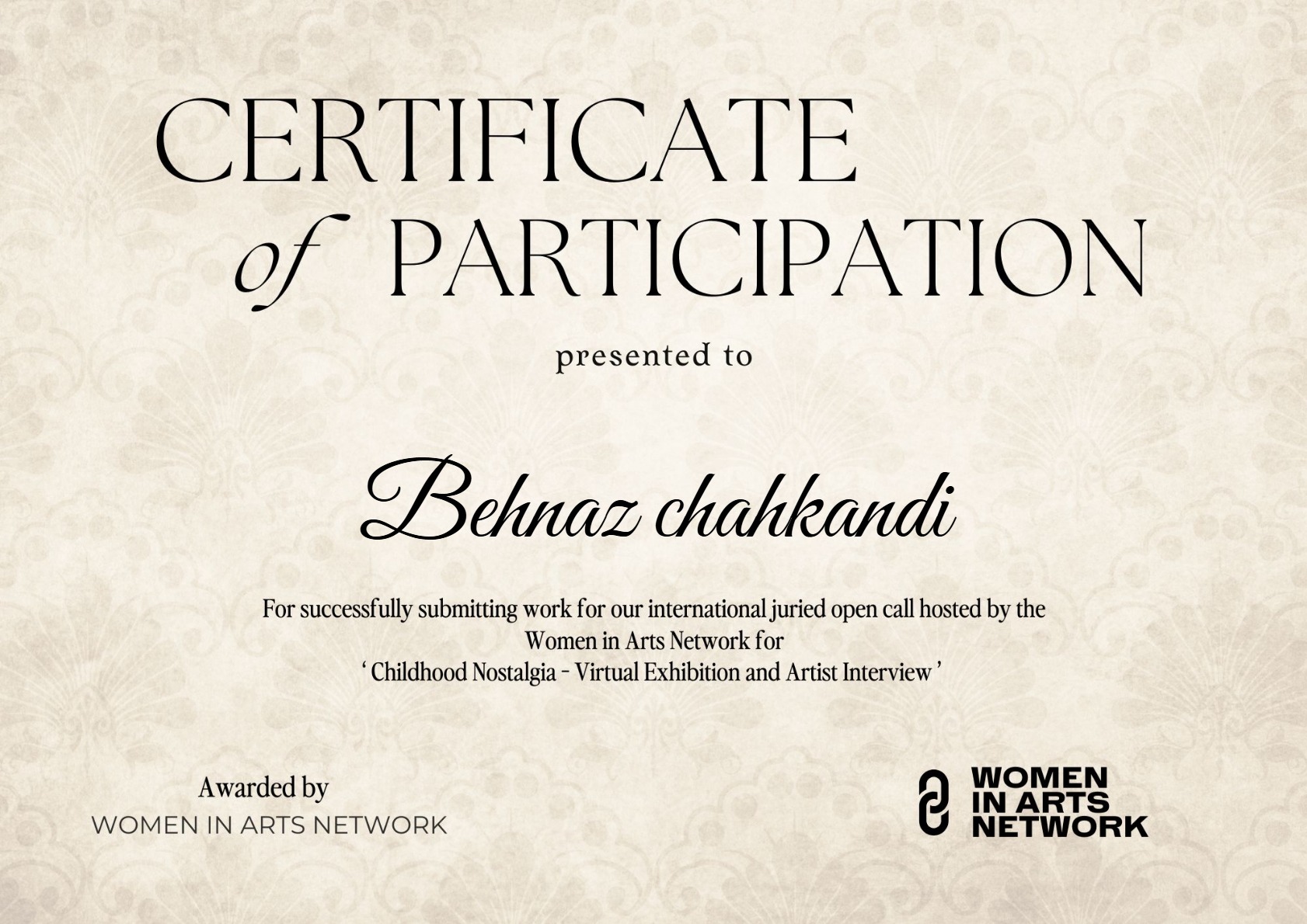 • Childhood Nostalgia – Virtual Exhibition & Artist Interview (2025) Participating Artist – Women in Arts Network Certificate of Participation awarded for submission and inclusion in the international open call organized by Women in Arts Network.