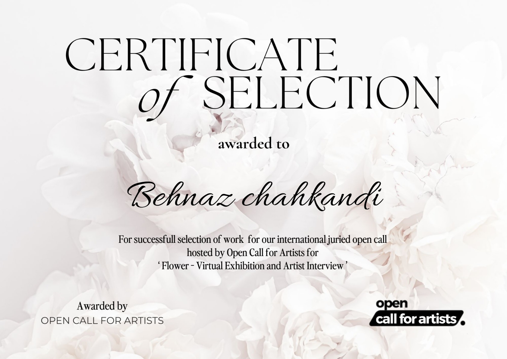• Flower – Virtual Exhibition & Artist Interview (2025) Selected Artist – Open Call for Artists Certificate of Selection awarded for successful participation in the juried international open call hosted by Open Call for Artists.