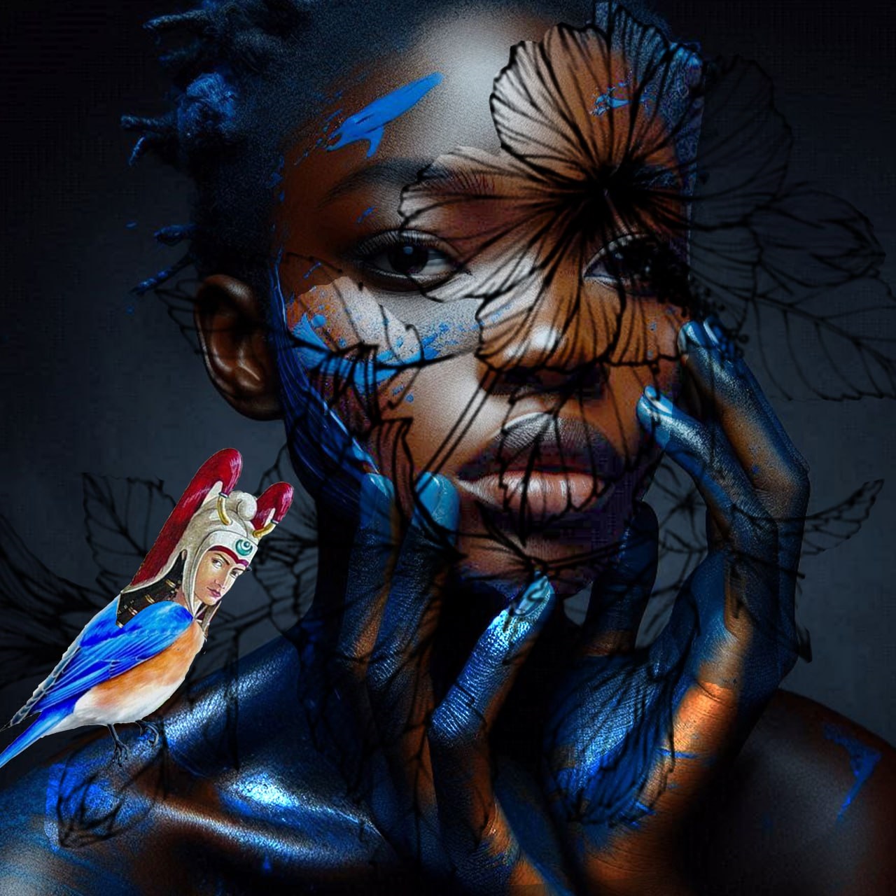 • Blue and Black Colors: The shimmering blue paint on her skin creates a surreal and dramatic effect, symbolizing mystery, spirituality, or a symbolic aspect of identity.