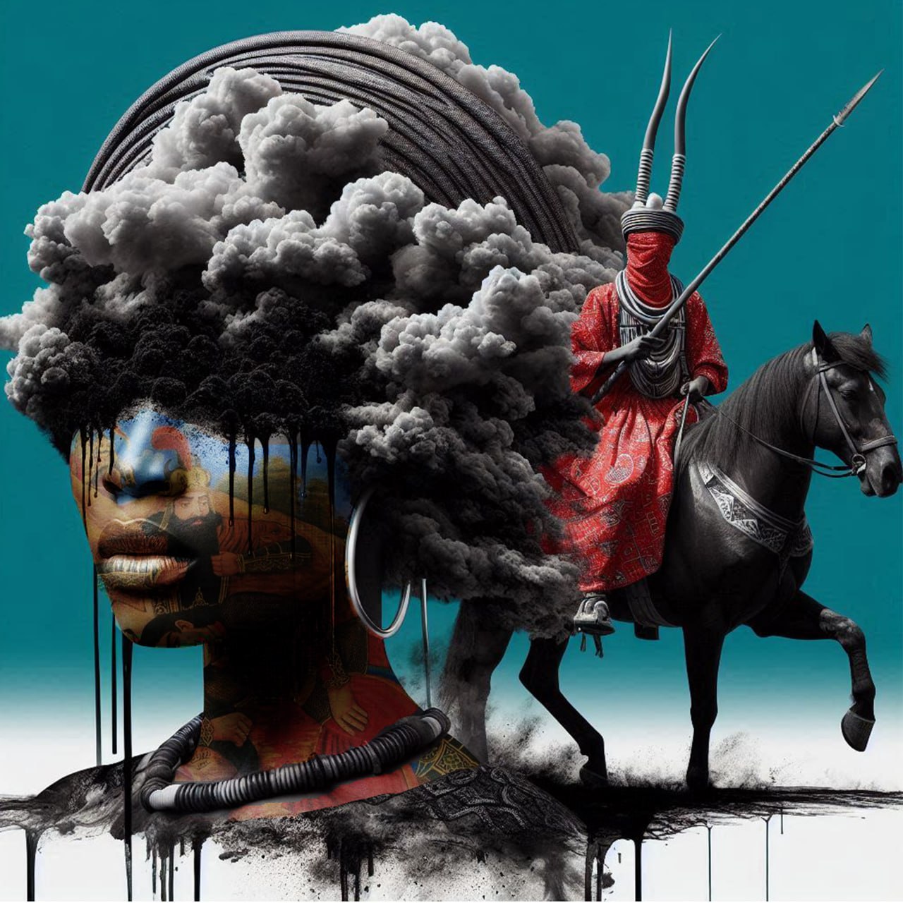 A surreal artwork blending Nigerian and Iranian cultures. It features an African woman whose skin is overlaid with mythical Persian paintings. Within her face, the image of Rostam, the great hero of the Shahnameh, is visible. This symbolic fusion portrays the mythical connection between the two cultures. Her hair transforms into dark clouds, dripping ink-like droplets, symbolizing history and identity in a state of transformation. Rostam, one of the most legendary figures in Ferdowsi’s Shahnameh, represents strength, courage, and loyalty. He belonged to the noble house of Zabul and defended Iran in countless battles. One of his most famous stories is the Seven Trials of Rostam, where he overcomes seven deadly challenges to rescue King Kavous from the demons. Another tragic tale is his unwitting battle against his own son, Sohrab, whom he unknowingly kills. This tragedy reflects themes of fate, destiny, and ignorance in Persian culture. In the background, a Fulani or Hausa warrior is seen riding a black horse. He wears a helmet with tall, curved horns, symbolizing power and bravery in Fulani culture. His red robe, adorned with traditional patterns, resembles the attire of warriors from the Sokoto Empire in 19th-century Nigeria. His face is covered by a mask, reminiscent of the Kanem-Bornu warriors from northern Nigeria. The warrior holds a long spear, a traditional Fulani weapon, representing their expertise in horseback combat. This image connects Nigerian warriors and Persian mythical heroes, as if they exist within a shared historical realm. The artistic style is modern surrealism, incorporating mixed media, oil painting, and digital art techniques, creating a dynamic and unique visual fusion of African and Persian cultures. “Legacy of the Forgotten Warriors” This ART reflects the deep connection between past and present, mythology and reality, and the fusion of Iranian and Nigerian cultures. The warrior in the background symbolizes strength and historical pride, while the woman’s face, covered with dark clouds and Qajar-era art, tells a story of identity, colonization, and resilience.