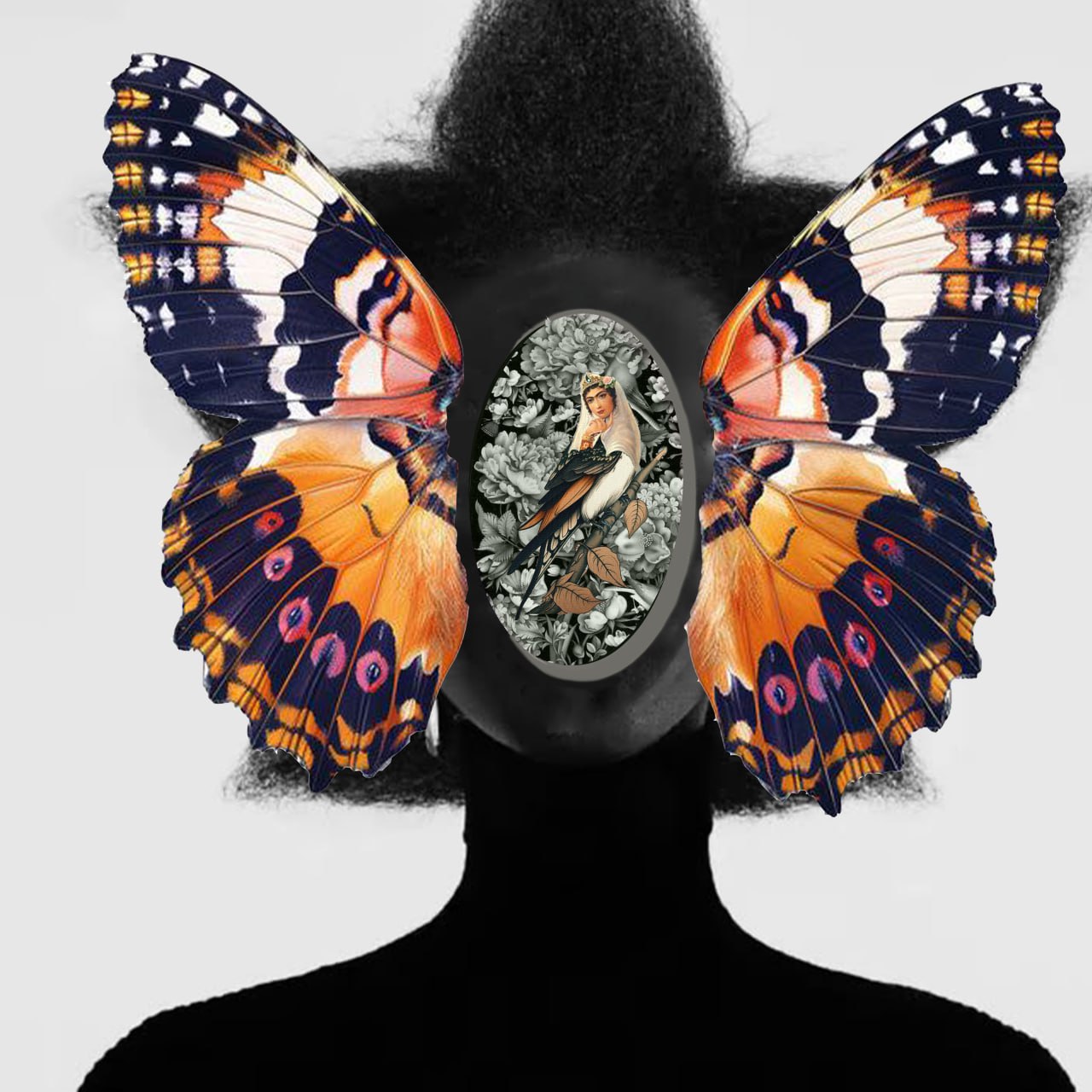 This image is a surreal and symbolic composition featuring a Nigerian woman with natural, voluminous hair at the center. However, her face has been replaced by the wings of a butterfly. The butterfly, with its vibrant orange, black, and white hues, symbolizes life, transformation, and feminine freedom. At the center of her face, instead of facial features, there is an ornamental oval containing an image of a bird—but this bird is actually a Qajar-era woman. This concept symbolically represents the idea that the bird carries the spirit of a woman from the past, merging into the butterfly and becoming part of the Nigerian woman’s identity. Deeper Meaning of the Image: • The butterfly = A symbol of metamorphosis, rebirth, and female liberation • The Nigerian woman = A representation of strength, identity, and the modern life of African women • The bird-Qajar woman = A symbol of historical femininity, tradition, and a lingering memory of the past that still exists within today’s women This composition illustrates that women, regardless of culture or background, exist in a continuous cycle of transformation, identity, and liberation. The bird, with the face of a Qajar woman, metaphorically carries the legacy of womanhood from the past into the present. This artwork beautifully blends historical and modern identities within a dynamic and emotionally charged visua