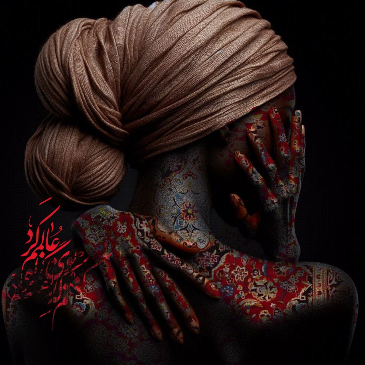 The artwork Silent Confession portrays an internal struggle, identity, and the weight of past memories. A woman, her body adorned with Persian carpet motifs and inscribed with Persian poetry, stands in a state of contemplation and silence. Her head is wrapped in a delicate fabric, symbolizing outward serenity, while her intricately patterned hands cover her face—caught between release and entrapment in past emotions. The Persian verse on her body reads: “I said that the scent of your hair led me astray.” This line reflects longing, temptation, and the lingering presence of memories that refuse to fade. Her body, transformed into a canvas of Iranian artistry, tells a story of love, attachment, and the journey toward freedom. The Persian carpet patterns—symbols of history, heritage, and cultural depth—merge with her inner state, creating a contrast between tradition and personal emotion. Beneath the surface of the image, a hidden message whispers: “I hold you, don’t worry. The past is the past, let it go and move on.” This piece is a visual journey between the past and the future, between memory and release, between love and self-discovery—like a letter from oneself to oneself, an invitation to embrace, find peace, and move forward.